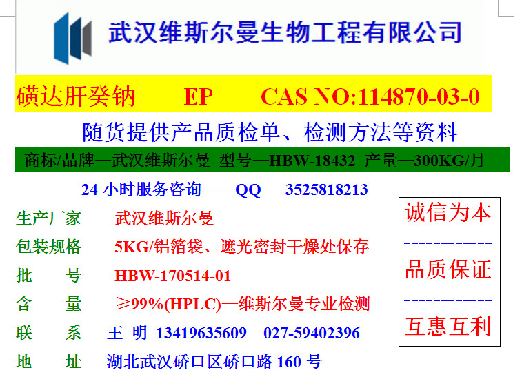 | HBW-18432 | 維斯?fàn)柭?/th> | 99% | 5KG/鋁箔袋 | 需詢盤 | 3天 |