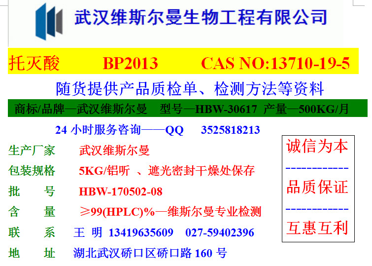 | HBW-30617 | 維斯?fàn)柭?/th> | 99% | 25KG/紙板桶 | 需詢盤 | 1天 |