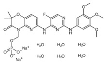 | 英文名 | 2H-Pyrido[3,2-b]-1,4-oxazin-3(4H)-one, 6-[[5-fluoro-2-[(3,4,5-trimethoxyphenyl)amino]-4-pyrimidinyl]amino]-2,2-dimethyl-4-[(phosphonooxy)methyl]-, disodium salt, hexahydrate | ||||