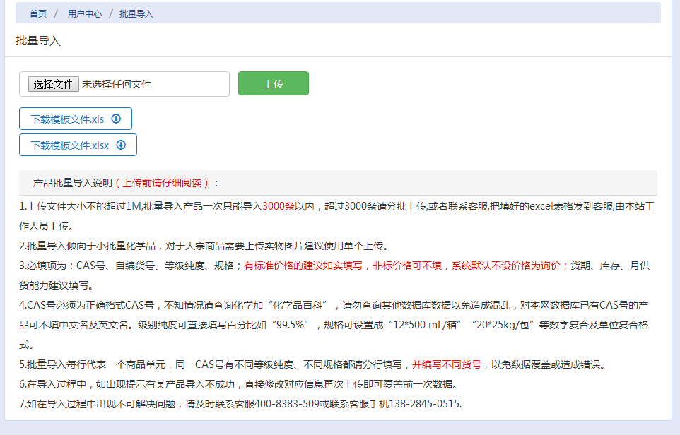 步驟三:填寫并保存好您的模板文件之后,點擊“選擇文件”按鈕,選擇您要上傳的模板文件,點擊“上傳”,之后的頁面會提示您上傳的結(jié)果。若出現(xiàn)下面頁面,顯示沒有數(shù)據(jù)填寫有誤,以及符合規(guī)范的數(shù)據(jù)與您要發(fā)布的CAS號數(shù)目一致,說明您的上傳是成功的,沒有問題,忽略下方的頁面錯誤的顯示。上傳成功之后,您還需要等待幾分鐘的產(chǎn)品審核時間。審核通過后,在您的店鋪里就可以看到您發(fā)布的產(chǎn)品。