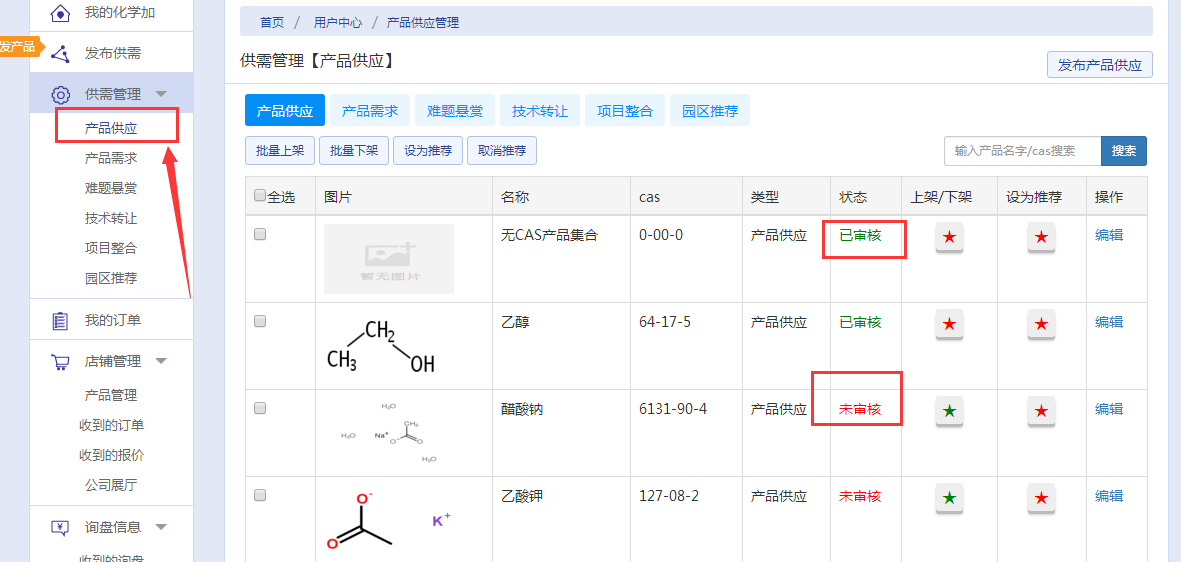 步驟四:批量上傳產(chǎn)品之后,您可以在用戶中心頁面,點擊“供需管理”按鈕,下拉的菜單中點擊“產(chǎn)品供應(yīng)”的按鈕,就可以查看您發(fā)布的產(chǎn)品是否通過了審核,也可以對其進(jìn)行上架下架,編輯內(nèi)容等操作。