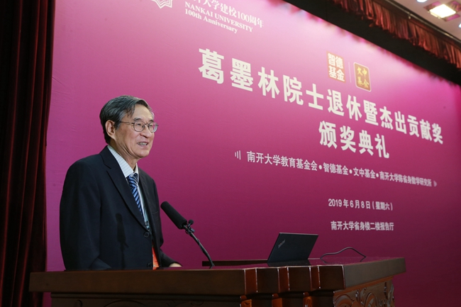 葛墨林院士在答謝詞中感謝天津市和南開大學(xué)多年來的關(guān)心與厚愛,感謝各位院士專家朋友多年來的支持和幫助,感謝智德基金、文中基金的獎勵。他說,回憶起來南開30余年,感慨萬千,感恩南開大學(xué)對我的培養(yǎng)和關(guān)懷,深刻體會到“允公允能,日新月異”南開精神的深邃。常言道:“三十年河?xùn)|,三十年河西”,而自己的經(jīng)歷恰好相反。從1956年上大學(xué)開始到1983年這30年間,除了出國研究、教學(xué)外,一直在蘭州大學(xué)工作;而1986年到南開大學(xué)工作至今,恰好又是30余年。在南開工作時期,正是我學(xué)術(shù)進(jìn)步的關(guān)鍵階段。南開給我創(chuàng)造了很好的條件,使得我在科研、教學(xué)上有了質(zhì)的飛躍。我愿以感恩的情懷將余生繼續(xù)獻(xiàn)給南開、報答南開的厚愛,也希望青年學(xué)子們,向在座的院士和專家學(xué)習(xí),自強(qiáng)奮發(fā),做出自己的貢獻(xiàn),為南開爭光。