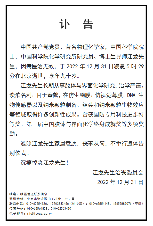 導(dǎo)讀:中國(guó)共產(chǎn)黨黨員、著名物理化學(xué)家,中國(guó)科學(xué)院院士,中國(guó)科學(xué)院化學(xué)研究所研究員、博士生導(dǎo)師江龍先生,因病醫(yī)治無(wú)效,于2022年12月31日凌晨5時(shí)29分在北京逝世,享年九十歲。