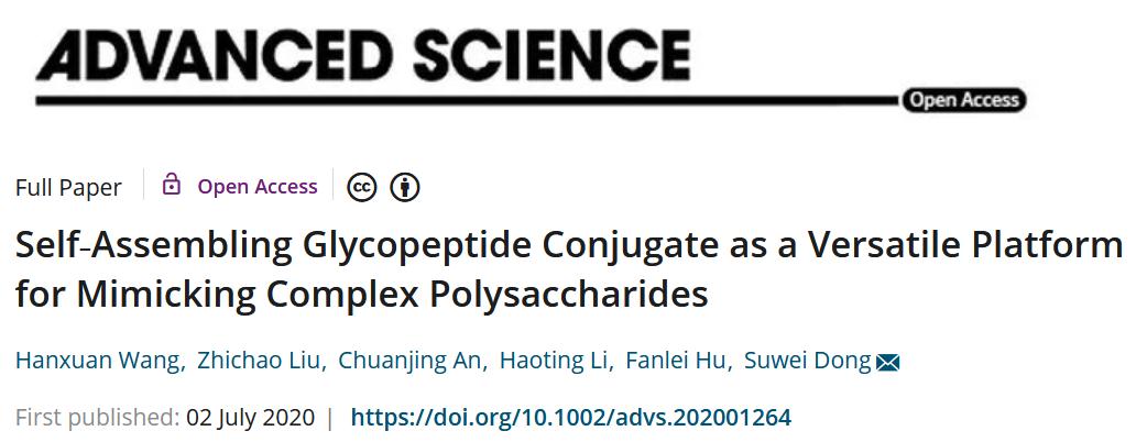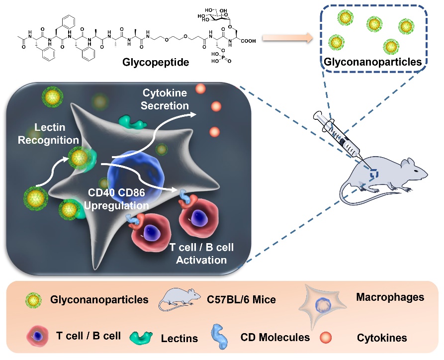 天然多糖通常分子量較大、結(jié)構(gòu)復(fù)雜且均一度差,難以獲取結(jié)構(gòu)明確的分子進(jìn)行系統(tǒng)的構(gòu)效關(guān)系研究,因而極大限制了這類化合物在醫(yī)藥領(lǐng)域的進(jìn)一步應(yīng)用。相比之下,使用人工合成的糖綴合物骨架模擬天然復(fù)雜多糖,將可能精準(zhǔn)地控制化合物結(jié)構(gòu)并進(jìn)行合理優(yōu)化和改造,有望獲得新的具有免疫活化作用的分子或可用于相關(guān)疾病治療的先導(dǎo)結(jié)構(gòu)。董甦偉團(tuán)隊(duì)設(shè)計(jì)并使用自組裝多肽作為骨架結(jié)構(gòu),以天然存在的糖苷鍵連接單糖,形成糖肽綴合物組成的納米顆粒,進(jìn)而模擬天然復(fù)雜多糖以多表位結(jié)合相應(yīng)受體的模式。在合成得到含有不同單糖的幾類糖肽綴合物中,經(jīng)甘露糖修飾的結(jié)構(gòu)在形成納米顆粒后顯示出顯著的免疫激活效果:在體外細(xì)胞實(shí)驗(yàn),以及小鼠體內(nèi)作為免疫佐劑,均展現(xiàn)了良好的免疫活化效果和生物安全性。與文獻(xiàn)報(bào)道的基于脂質(zhì)體、樹(shù)枝狀分子等的多糖模擬結(jié)構(gòu)相比,使用該自組裝糖肽作為骨架,具有易于合成、修飾和改造,生物兼容度高等優(yōu)勢(shì),也為后續(xù)進(jìn)一步優(yōu)化自組裝單體結(jié)構(gòu)、發(fā)現(xiàn)更有效和適宜搭載的糖表位,以及更深入探索糖鏈的生物學(xué)功能,提供了一個(gè)適宜的平臺(tái)。