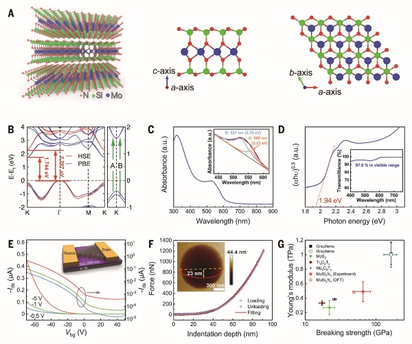 圖3. 二維層狀MoSi2N4的原子結(jié)構(gòu)、電子結(jié)構(gòu)、及光學(xué)、電學(xué)和力學(xué)性質(zhì)