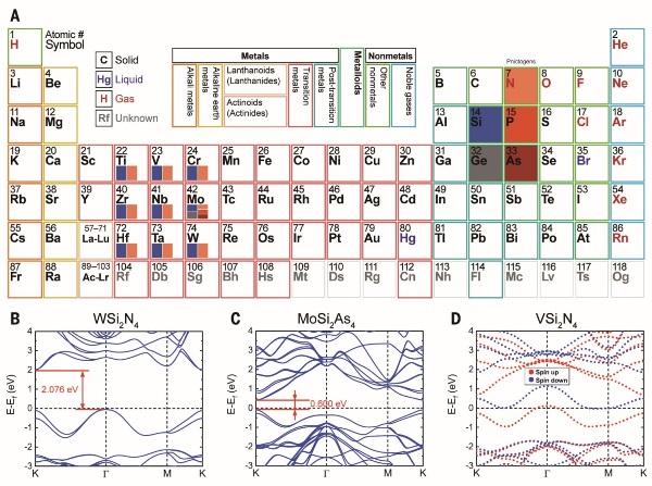 在此基礎(chǔ)上,他們與金屬所陳星秋研究組和孫東明研究組合作,發(fā)現(xiàn)單層MoSi2N4具有半導(dǎo)體性質(zhì)(帶隙約1.94 eV)和優(yōu)于MoS2的理論載流子遷移率,還表現(xiàn)出優(yōu)于MoS2等單層半導(dǎo)體材料的力學(xué)強(qiáng)度和穩(wěn)定性;并通過(guò)理論計(jì)算預(yù)測(cè)出了十多種與單層MoSi2N4具有相同結(jié)構(gòu)的二維層狀材料,包含不同帶隙的半導(dǎo)體、金屬和磁性半金屬等。