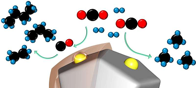 CO2(黑色和紅色)和氫分子(藍色)在釕基催化劑的幫助下發(fā)生反應。在右邊,未涂層的催化劑產生最簡單的碳氫化合物甲烷。在左側,涂層催化劑產生更長鏈的碳氫化合物,如丁烷、丙烷和乙烷。圖片來源:陳榮治