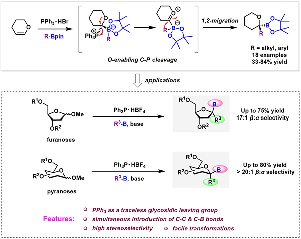 中科院天然產物有機合成化學重點實驗室何智濤課題組致力于不飽和烴的轉化及應用領域。近期,何智濤課題組在J. Am. Chem. Soc.上在線發(fā)表了題為“Stereoselective gem-C,B-Glycosylation via 1,2-Boronate Migration”的研究論文(J. Am. Chem. Soc. 2022, doi.org/10.1021/jacs.1c11842)。該研究工作實現了無金屬參與的三苯基膦介導的烯烴的1,1-碳硼化反應,并將其應用于立體選擇性的雙糖苷化修飾上,展現出潛在的應用價值。