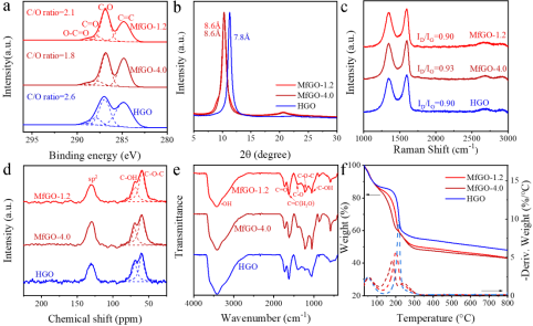 圖3.微通道制備(MfGO-X,X為反應(yīng)停留時(shí)間)與傳統(tǒng)方法(HGO)制備的氧化石墨烯的化學(xué)表征比較。