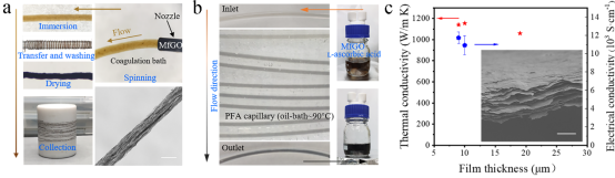 圖5.微流中展示組裝、微流還原及得到的石墨烯薄膜導(dǎo)熱導(dǎo)電性能。