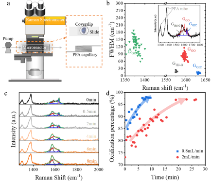 此外,小尺寸且透明的微反應(yīng)器使得利用光譜實(shí)時(shí)檢測氧化進(jìn)程成為可能。作者通過原位表征石墨氧化中的拉曼G峰演變,分析了流速、原料石墨種類和片徑等對氧化反應(yīng)動(dòng)力學(xué)的影響。在此基礎(chǔ)上,還驗(yàn)證了在微通道中對氧化石墨烯進(jìn)行還原、組裝的能力,并展示了氧化石墨烯產(chǎn)物的導(dǎo)熱導(dǎo)電性能,為利用微流體技術(shù)實(shí)現(xiàn)氧化石墨烯的制備與應(yīng)用奠定基礎(chǔ)。