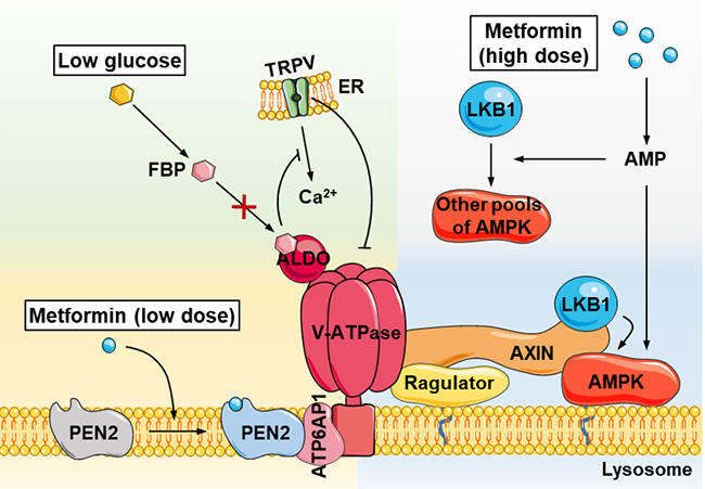 導(dǎo)讀:近日,中國科學(xué)院大連化學(xué)物理研究所中國科學(xué)院分離分析化學(xué)重點(diǎn)實(shí)驗(yàn)室生物分子功能與機(jī)制研究組(1821組)樸海龍研究員團(tuán)隊(duì)與廈門大學(xué)林圣彩院士團(tuán)隊(duì)和鄧賢明教授團(tuán)隊(duì)合作,鑒定到二甲雙胍直接作用的分子靶點(diǎn)為PEN2(γ-secretase的亞基),并進(jìn)一步揭示了這一分子間的相互作用介導(dǎo)的溶酶體途徑,激活A(yù)MPK的具體方式,闡釋了AMPK相關(guān)途徑在二甲雙胍所介導(dǎo)的降糖、延長(zhǎng)壽命和延緩衰老等功能上發(fā)揮的重要作用。