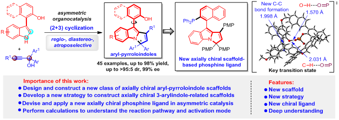 導(dǎo)讀:基于吲哚的軸手性骨架是一類性質(zhì)獨(dú)特的手性雜環(huán)骨架,所以催化不對(duì)稱構(gòu)建該類骨架已經(jīng)成為一個(gè)重要的研究領(lǐng)域。然而,該領(lǐng)域的研究仍處于起步階段,面臨著一系列挑戰(zhàn)性問(wèn)題,例如:設(shè)計(jì)與構(gòu)建新型基于吲哚的軸手性骨架、探索該類骨架在手性催化劑和配體等方面的應(yīng)用。近日,江蘇師范大學(xué)化學(xué)與材料科學(xué)學(xué)院石楓課題組設(shè)計(jì)了一類新型的基于吲哚的軸手性骨架——芳基吡咯并吲哚骨架,并且通過(guò)有機(jī)催化下3-芳基吲哚平臺(tái)分子與炔丙醇的不對(duì)稱(2 + 3)環(huán)化反應(yīng)的策略,實(shí)現(xiàn)了該類骨架的對(duì)映選擇性構(gòu)建。更重要的是,該類新型軸手性骨架衍生的三級(jí)膦,在鈀催化的不對(duì)稱反應(yīng)中能夠作為高效的手性配體。此外,通過(guò)理論計(jì)算,實(shí)現(xiàn)了對(duì)反應(yīng)機(jī)理和活化模式的深入理解。該工作為構(gòu)建基于吲哚的軸手性骨架提供了新策略,有望在不對(duì)稱催化中發(fā)現(xiàn)更多的應(yīng)用(Fundamental Research, 2022, DOI: 10.1016/j.fmre.2022.01.002)。