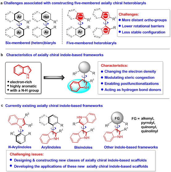 軸手性二芳基骨架是一類重要的手性結(jié)構(gòu)單元,不僅廣泛存在于天然產(chǎn)物、藥物活性分子以及功能材料中,而且被應(yīng)用于手性配體和手性催化劑。所以,催化不對(duì)稱構(gòu)建軸手性骨架引起了化學(xué)工作者們的強(qiáng)烈關(guān)注。目前,該領(lǐng)域發(fā)展尤為迅速的是軸手性六元(雜)芳基骨架的構(gòu)建,例如:軸手性聯(lián)萘、聯(lián)苯和1-芳基異喹啉骨架。與之相比,軸手性五元雜芳基骨架的催化不對(duì)稱構(gòu)建卻發(fā)展緩慢,主要是由于此類骨架存在鄰位基團(tuán)距離較遠(yuǎn)、旋轉(zhuǎn)能壘較低、構(gòu)型穩(wěn)定性較差等挑戰(zhàn)性問(wèn)題(1a)。因此,催化不對(duì)稱構(gòu)建軸手性五元雜芳基骨架的探索依然是任重而道遠(yuǎn)。