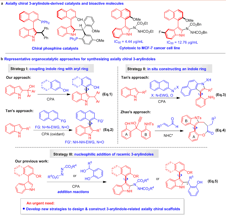 在目前已構(gòu)建的軸手性吲哚骨架中,3-芳基吲哚骨架由于在手性膦催化劑和生物活性分子中的應(yīng)用(2a,該類骨架的構(gòu)建具有重要意義,而不對(duì)稱有機(jī)催化被認(rèn)為是構(gòu)建軸手性骨架的一種強(qiáng)有力方法。目前,不對(duì)稱有機(jī)催化構(gòu)建軸手性3-芳基吲哚骨架的代表性策略主要三種(2b。第一種策略是手性磷酸(CPA)催化下吲哚環(huán)與芳環(huán)的直接偶聯(lián)策略,主要包括石楓課題組發(fā)展的2-吲哚甲醇與2-萘酚的偶聯(lián)反應(yīng)(Eq. 1Angew. Chem. Int. Ed. 201756116)、南方科技大學(xué)譚斌課題組發(fā)展的2-取代吲哚與偶氮萘或亞硝基萘的偶聯(lián)反應(yīng)(Eq. 2, Nat. Chem. 20181058; Chem 2020, 6, 2046第二種策略是有機(jī)催化下原位構(gòu)建吲哚環(huán)的策略,主要包括譚斌課題組發(fā)展的CPA催化下2-取代吲哚與偶氮萘或亞硝基萘的重排反應(yīng)(Eq. 3, Nat. Chem. 20181058; Chem 2020, 6, 2046)、新加坡國(guó)立大學(xué)趙宇課題組發(fā)展的手性氮雜卡賓(NHC*)催化下炔丙醇與烯醛的串聯(lián)反應(yīng)(Eq. 4, J. Am. Chem. Soc. 201914117062;第三種策略是CPA催化下外消旋3-芳基吲哚的親核加成反應(yīng),主要是石楓課題組發(fā)展的3-芳基吲哚平臺(tái)分子與偶氮二羧酸酯或鄰羥基芐醇的加成反應(yīng)(Eq. 5, Angew. Chem. Int. Ed. 20195815104)。盡管有了這些報(bào)道,催化不對(duì)稱構(gòu)建該類骨架的策略仍然非常有限。所以,迫切需要發(fā)展新策略,以實(shí)現(xiàn)基于3-芳基吲哚的軸手性骨架的設(shè)計(jì)與構(gòu)建。
