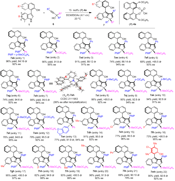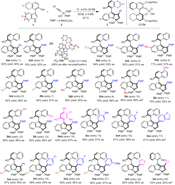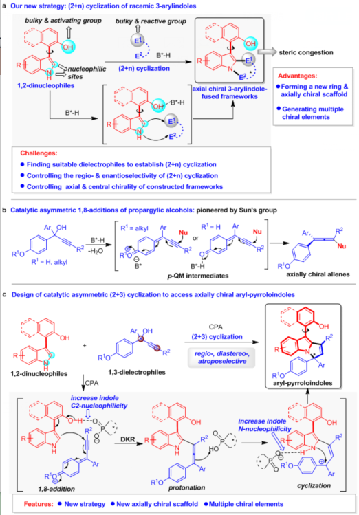 所以,在該工作的設(shè)計(jì)中3c作者設(shè)想類炔丙醇可以作為合適的1,3-雙親電試劑,CPA催化下與3-芳基吲哚發(fā)生對(duì)映選擇性的(2 + 3)環(huán)化反應(yīng),從而構(gòu)建新型的軸手性芳基吡咯并吲哚骨架。該反應(yīng)將通過(guò)動(dòng)態(tài)動(dòng)力學(xué)拆分DKR,先發(fā)生1,8-加成反應(yīng),產(chǎn)生手性聯(lián)烯中間體,再經(jīng)歷質(zhì)子化和分子內(nèi)環(huán)化過(guò)程,生成軸手性芳基吡咯并吲哚。在反應(yīng)過(guò)程中,CPA可以依次活化3-芳基吲哚的OHNH基團(tuán),從而控制(2 + 3)環(huán)化反應(yīng)的區(qū)域選擇性。此外,CPA與底物和中間體之間的相互作用,將促進(jìn)DKR過(guò)程和立體選擇性的分子內(nèi)環(huán)化,從而控制所構(gòu)建的芳基吡咯并吲哚骨架的軸手性和中心手性。因此,所設(shè)計(jì)的(2 + 3)環(huán)化反應(yīng)將為構(gòu)建基于吲哚的新型軸手性骨架提供新策略,并且可以同時(shí)控制多重手性元素。