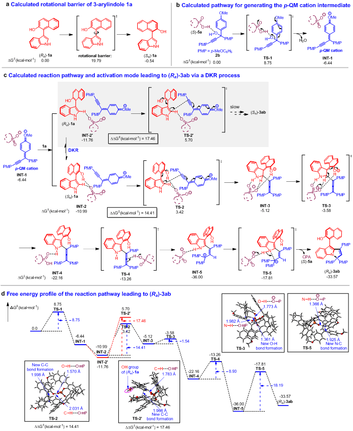 為了深入理解這一反應(yīng)石楓課題組與湖南科技大學(xué)焦銀春課題組進(jìn)行合作,對(duì)合成產(chǎn)物(Ra)-3ab的可能反應(yīng)路徑和活化模式進(jìn)行了理論計(jì)算(8)。首先,計(jì)算出底物1a的旋轉(zhuǎn)能壘為19.79 kcal mol-18a),遠(yuǎn)低于可分離出阻旋異構(gòu)體所需的24 kcal mol-1,這說(shuō)明(Ra)-1a在室溫下很容易轉(zhuǎn)化為(Sa)-1a,從而有利于后續(xù)的DKR過(guò)程。同時(shí),計(jì)算表明,炔丙醇2bCPA (S)-5a的催化下容易脫水,經(jīng)過(guò)過(guò)渡態(tài)TS-1生成p-QM陽(yáng)離子中間體INT-18b)。隨后,作者詳細(xì)計(jì)算了可能的反應(yīng)路徑和活化模式8c,并且歸納了反應(yīng)過(guò)程的自由能壘圖8d。值得注意的是,在反應(yīng)的關(guān)鍵過(guò)渡態(tài)TS-2中,催化劑(S)-5a不僅與底物(Sa)-1aOH基團(tuán)和CH基團(tuán)同時(shí)形成兩個(gè)氫鍵,而且與p-QM陽(yáng)離子產(chǎn)生離子對(duì)作用,從而促進(jìn)它們之間的1,8-加成反應(yīng)。然而,在TS-2,由于底物(Ra)-1aOH基團(tuán)距離催化劑(S)-5a遠(yuǎn),使(S)-5a只能(Ra)-1aCH基團(tuán)形成氫鍵,并不能與(Ra)-1aOH基團(tuán)形成氫鍵,導(dǎo)致底物(Ra)-1a(Sa)-1a難以進(jìn)行1,8-加成反應(yīng)。所以,TS-2TS-2中底物與催化劑之間的不同活化模式導(dǎo)致了它們能壘的差異(3.05 kcal mol-1),從而解釋了反應(yīng)的DKR過(guò)程和高對(duì)映選擇性生成(Ra)-3ab的原因。