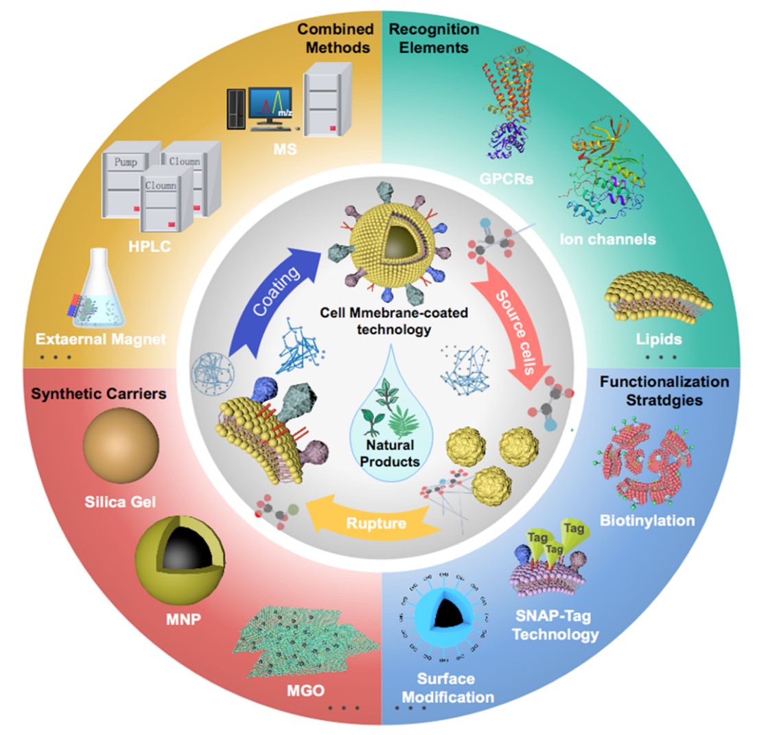 卜羽思助理教授在王嗣岑教授和解笑瑜副教授指導下,以團隊之前的工作為基礎總結(jié)了一系列用于從中藥等天然產(chǎn)物中篩選藥物的天然細胞膜涂層的仿生材料?;谔烊患毎ね繉拥姆律夹g(shù)用于中藥活性成分篩選研究具有效率高、靈敏度高以及特異性強等優(yōu)勢,并且能夠在一定程度上輔助闡明藥物的作用機制。這項技術(shù)所制備的細胞膜包覆材料既可以整合無機材料的物理化學性質(zhì),又能繼承源細胞表面復雜的生物功能。綜述系統(tǒng)地描述了該技術(shù)使用細胞膜涂層進行藥物特異性篩選的理論基礎,總結(jié)了包括細胞膜色譜在內(nèi)的4種不同策略,評價了不同策略用于藥物發(fā)現(xiàn)的優(yōu)缺點,并對該項技術(shù)未來的挑戰(zhàn)和發(fā)展進行了總結(jié)和討論。