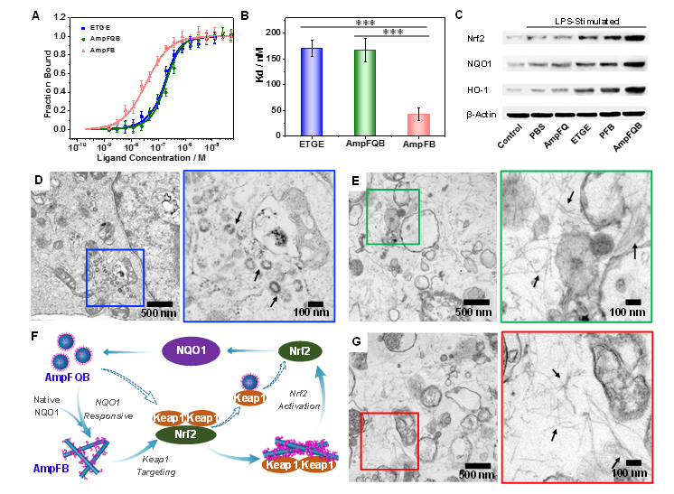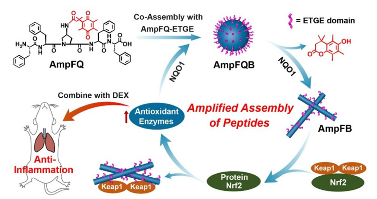 在多肽可控組裝策略及生物醫(yī)用功能材料的前期研究基礎(chǔ)上,余志林團(tuán)隊(duì)通過(guò)設(shè)計(jì)并合成醌丙酸修飾的多肽AmpFQ及其衍生物AmpFQ-ETGE(其中ETGE序列源自Nrf2結(jié)構(gòu)域),以炎癥巨噬細(xì)胞中NADH-醌脫氫酶1(NQO1)為例,構(gòu)建了一套“多肽自放大組裝體系”。