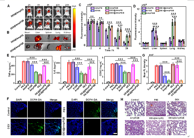 圖3. 自放大組裝體系DEX@AmpFQB的活體急性肺損傷抗炎治療效果。圖片來(lái)源:J. Am.Chem.Soc.