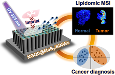 脂質(zhì)與細(xì)胞增殖、細(xì)胞物質(zhì)交換與能量交換、細(xì)胞信號(hào)傳導(dǎo)等重要生理生化過程密切相關(guān)?;诳臻g脂質(zhì)組學(xué)的分子病理研究對于推動(dòng)精準(zhǔn)醫(yī)學(xué)的發(fā)展具有重要意義。質(zhì)譜成像是空間脂質(zhì)組學(xué)的主要解決方案。其中,基質(zhì)輔助激光解吸離子化質(zhì)譜成像( MALDI-MSI)是應(yīng)用最為廣泛的質(zhì)譜成像技術(shù),但由于有機(jī)小分子基質(zhì)的背景干擾、結(jié)晶不均勻性及前處理時(shí)間長等缺點(diǎn)使得常規(guī)MALDI-MSI在臨床應(yīng)用中受到阻礙?;瘜W(xué)系鄔建敏課題組此前在免基質(zhì)脂質(zhì)分析領(lǐng)域開展了一系列的研究。該課題組利用垂直硅納米線(SiNW)頂端的電磁增強(qiáng)效應(yīng),提出了頂端接觸取樣原位離子化質(zhì)譜技術(shù)(TCSI-MS),實(shí)現(xiàn)了組織樣本脂質(zhì)分子的快速獲?。?/span>ACS Appl. Mater. Interfaces,201810, 14389.與附屬邵逸夫醫(yī)院合作成功地將TCSI-MS技術(shù)應(yīng)用于肝癌組織樣本的良惡性判斷和切緣判別 (Anal. Chem. 2019,91, 10376)。TCSI-MS技術(shù)通過組織與納米線頂端的接觸,將組織脂質(zhì)分子轉(zhuǎn)印到納米線,在后續(xù)的質(zhì)譜分析中,激光轟擊納米線頂端進(jìn)而實(shí)現(xiàn)組織樣本分子的無損分析。該方法支持同一個(gè)組織樣本的跨平臺(tái)分析,便于獲取多組學(xué)分子信號(hào)。然而,因硅納米線陣列表面的空間不均勻性,TCSI-MS在組織成像、空間代謝組或脂質(zhì)組學(xué)的應(yīng)用仍然面臨挑戰(zhàn)。發(fā)展一種能高保真呈現(xiàn)脂質(zhì)分子在組織表面空間分布的免標(biāo)記成像基板是解決TCSI-MS在分子病理領(lǐng)域應(yīng)用的關(guān)鍵。