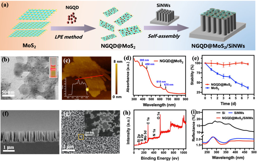 圖 1. aNGQD@MoS2/SiNW基板合成流程示意圖;(bNGQD@MoS2納米片TEM圖像;(cNGQD@MoS2納米片AFM圖像;(dNGQD@MoS2納米片紫外吸收曲線;eNGQD@MoS2MoS2納米片穩(wěn)定性比較;(fNGQD@MoS2/SiNW截面SEM圖像;(gNGQD@MoS2/SiNWs表面 SEM圖像;(hNGQD@MoS2/SiNW XPS譜圖;(iSi,SiNWs, NGQD@MoS2/SiNWs紫外漫反射曲線。