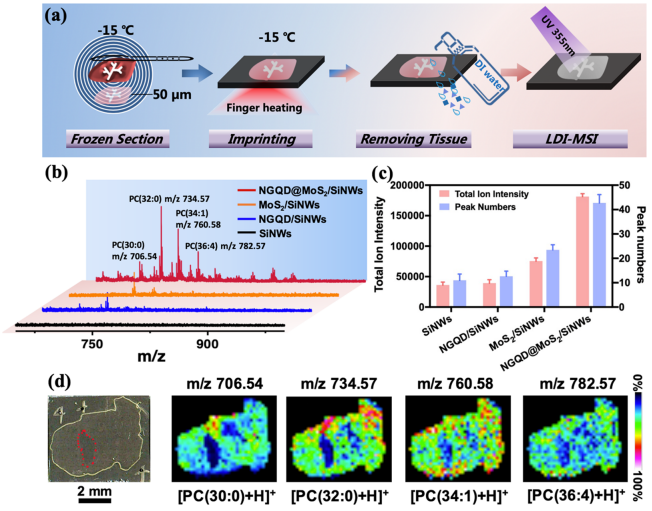 研究人員首先使用自下而上生長的兩親性氮摻雜石墨烯量子點(diǎn)(NGQD)作為插層劑和分散劑來輔助MoS2的液相剝離,以獲得薄而穩(wěn)定的NGQD@MoS2二維納米片。然后通過自組裝過程將它們負(fù)載到硅納米線(SiNWs)的頂端,獲得一種新型的NGQD@MoS2/SiNWs質(zhì)譜成像基板(圖1)。