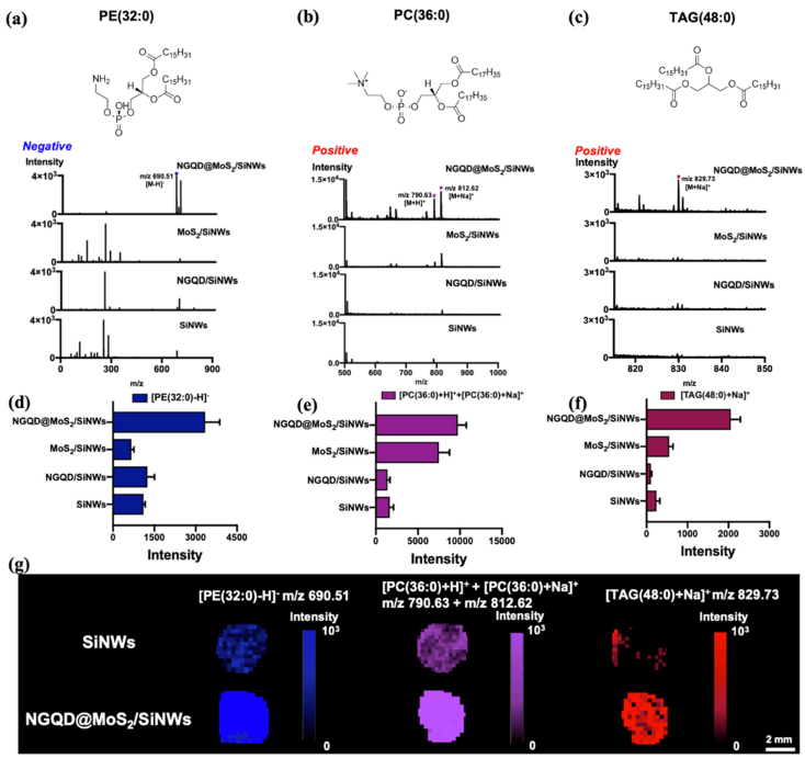 在脂質(zhì)標(biāo)準(zhǔn)品測試中,通過與MoS2/SiNWs、NGQD/SiNWsSiNWs基板對比,NGQD@MoS2/SiNWs基板顯示出優(yōu)異的LDI性能(圖2 a-f)。同時(shí)為了驗(yàn)證基板表面是否能得到均一的質(zhì)譜信號(hào)(或“sweet-spots"效應(yīng)的消除),研究人員掃描了整個(gè)脂質(zhì)標(biāo)品液滴干燥沉積后的區(qū)域進(jìn)行質(zhì)譜成像,發(fā)現(xiàn)NGQD@MoS2/SiNWs基板的信號(hào)更強(qiáng)且更為均勻(圖2g)。