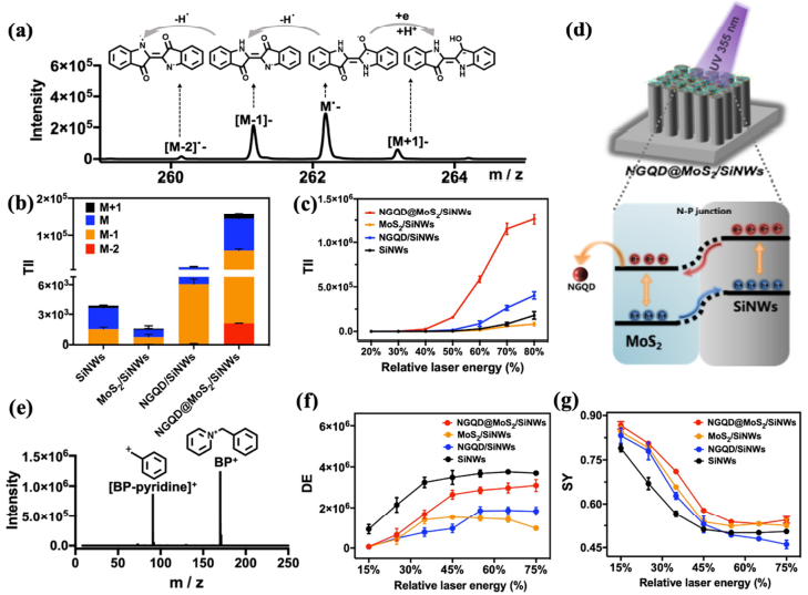 為研究復(fù)合材料的協(xié)同作用機(jī)制,研究人員用靛藍(lán)和芐基吡啶鹽作為模型分子探究了不同基板的表面光致電荷轉(zhuǎn)移能力、熱解吸及內(nèi)能轉(zhuǎn)換效率。從靛藍(lán)分子負(fù)離子模式下的總離子強(qiáng)度(圖3b)可以看出,NGQD@MoS2/SiNWs基板比SiNWs基板高出40倍,也遠(yuǎn)遠(yuǎn)高于MoS2/SiNWsNGQD/SiNWs基板。這可能是由于NGQD@MoS2具有超高的載流子壽命,而NGQD有益于促進(jìn)電荷轉(zhuǎn)移并有效抑制光致電子-空穴對的復(fù)合。載流子壽命的明顯提升及SiNW-MoS2P-N異質(zhì)結(jié)的共同作用,使得光致電荷轉(zhuǎn)移幾率得到極大的提升(圖3d)。通過對芐基吡啶鹽的檢測,發(fā)現(xiàn)NGQD@MoS2SiNWs復(fù)合后可將芐基吡啶鹽母離子存活率從54%提升到71%(圖3g),這是由于NGQD@MoS2納米片可以具有sp2結(jié)構(gòu),與SiNWs復(fù)合后,能量可以分散到sp2結(jié)構(gòu)中,從而降低內(nèi)部能量轉(zhuǎn)移,減少分子碎片,有助于LDI能力的提升。