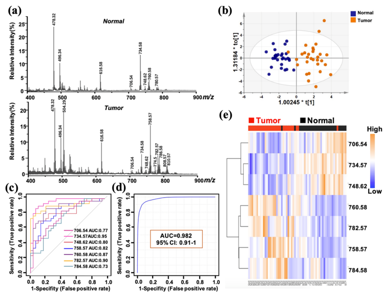 圖 5. (a)肺癌癌癥組織(Tumor)及其相鄰正常組織(Normal)成像后得到的平均譜圖;(b)OPLS-DA分?jǐn)?shù)圖;(c)單一生物標(biāo)志物ROC曲線及AUC值;(d)生物標(biāo)志物組ROC曲線及AUC值;(e)層狀聚類圖。