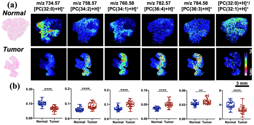 圖6. 肺癌癌癥組織(Tumor)及其相鄰正常組織(Normal)HE染色圖像及不同脂質(zhì)分子的質(zhì)譜成像圖。