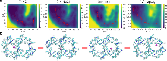 為進(jìn)一步提升離子滲透選擇性,團(tuán)隊(duì)通過界面生長策略首次構(gòu)筑了自具離散框架結(jié)構(gòu)的POC(CC3)離子分離膜,研究離子在多層次通道中的傳遞行為與分離特性。CC3是一種具有亞納米級窗口和納米級空腔的離散分子,通過窗口對窗口排列,形成由POC內(nèi)腔和POC間外腔組成的連續(xù)通道。CC3亞納米窗口可篩分一/二價(jià)離子,納米空腔為一價(jià)離子提供快速傳遞途徑,自具離散框架結(jié)構(gòu)的離子通道可降低離子與框架壁面碰撞消耗的能量,促進(jìn)離子滲透選擇性的提升。因此,CC3膜表現(xiàn)出很高的一價(jià)陽離子滲透速率(1.0 mol m?2 h?1)和極低的二價(jià)陽離子透過率,實(shí)現(xiàn)了高的離子選擇性,比如K+/Mg2+的選擇性~1031,Na+/Mg2+的選擇性~659,Li+/Mg2+的選擇性~283(圖1)。通過分子動力學(xué)模擬計(jì)算了離子在通道中遷移的自由能面,揭示了離子在離散CC3框架通道中的傳輸路徑(圖2a)。離子在CC3通道中由一個(gè)外腔傳遞到另一個(gè)外腔過程,以不同的水合狀態(tài)通過CC3的窗口從外腔向內(nèi)腔遷移,傳遞的能壘順序?yàn)椋篕+ < Na+ <Li+ << Mg2+(圖2b)。這項(xiàng)工作揭示了離子在POC離散框架通道中的傳遞特性,為開發(fā)高離子滲透選擇性分離膜提供了理論指導(dǎo)。