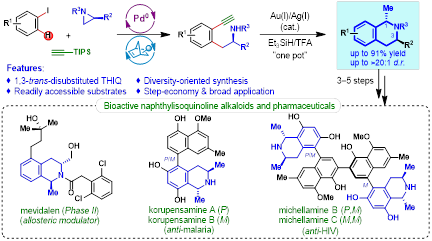 周強輝團隊近年來聚焦于Pd/NBE協(xié)同催化策略開發(fā)多取代芳烴的高效合成新方法。他們先后發(fā)展了異色滿(Angew.Chem. Int.Ed,2018, 57, 3444)和1,3-順式雙取代四氫異喹啉(Angew.Chem. Int. Ed.2018,57, 10980)的新合成方法,并應(yīng)用于復(fù)雜天然產(chǎn)物(–)-berkelic acid的全合成(Angew.Chem. Int. Ed.2021,60, 5141)。在這些研究基礎(chǔ)上,該課題組進一步發(fā)展了Pd/NBE協(xié)同催化與金催化環(huán)化/還原的串聯(lián)反應(yīng),只需使用簡單易得的三種基礎(chǔ)化學(xué)品為原料,就可以快速構(gòu)建出結(jié)構(gòu)多樣化的1,3-反式二取代四氫異喹啉化合物。他們應(yīng)用該方法簡潔地合成了藥物分子mevidalen的一個類似物,并發(fā)展了抗瘧活性天然產(chǎn)物korupensamine A和B的5步合成法以及抗HIV活性天然產(chǎn)物michellamine B和C的7步合成法,是迄今最短且最高效的全合成路線。這些高效的合成應(yīng)用展示了該合成方法在制備1,3-反式四氫異喹啉生物堿及相關(guān)藥物活性分子方面的巨大潛力。