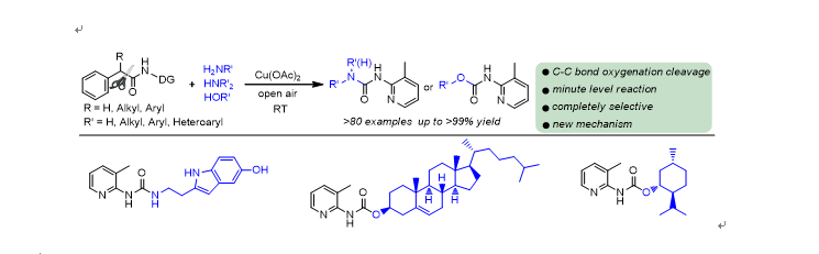 包永勝教授團隊一直致力于均相/多相過渡金屬催化有機液相反應(yīng)方法學(xué)研究。近期,通過一種螯合輔助與自由基氧基化聯(lián)合策略,實現(xiàn)了酰胺C-C鍵的化學(xué)專一性斷裂,在室溫下合成了多種尿素衍生物和氨基甲酸酯類化合物。反應(yīng)以醋酸銅為催化劑,空氣中的氧氣為氧化劑,該方法適用于各種芳基乙酰胺與伯胺、仲胺、芳香胺和醇類的結(jié)合,實現(xiàn)了溫和條件下利用過渡金屬催化的方法來合成尿素類化合物,增加了合成產(chǎn)率及底物普適性。其研究成果“From amides to urea derivatives or carbamates with chemospecific C-C bond cleavage at room temperature”在化學(xué)領(lǐng)域TOP期刊《Organic Chemistry Frontiers》上發(fā)表。全文鏈接:https://doi.org/10.1039/D1QO01922H