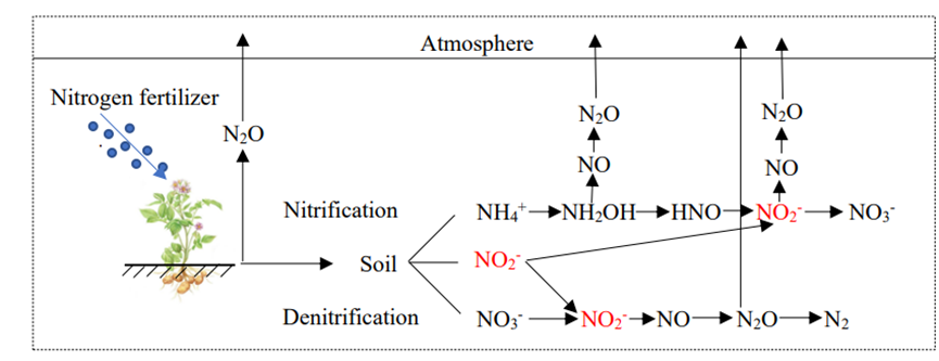 焦燕教授領(lǐng)銜的“陸地生態(tài)系統(tǒng)碳氮循環(huán)與全球變化團隊”一直致力于灌溉生產(chǎn)方式調(diào)控土壤氮肥運移機制方面的研究。近期,通過研究灌溉和施肥方式對土壤氮肥時空分布和去向的影響發(fā)現(xiàn),土壤氮肥在NH4+-NO2--NO3--N2O遷移轉(zhuǎn)化過程中,NO2-在氮肥N2O排放損失中起到至關(guān)重要作用,氮肥損失主要發(fā)生在馬鈴薯塊莖形成期和膨大期,農(nóng)田土壤氮肥N2O排放損失可以通過滴灌施肥模式調(diào)控,為保護大氣環(huán)境提供了切實可行的措施。其研究成果“Mechanisms underlying nitrous oxide emissions and nitrogen leaching from potato fields under drip irrigation and furrow irrigation”在水資源領(lǐng)域TOP期刊《Agricultural Water Management》上發(fā)表。