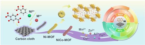 受限于單一金屬活性位點和低電導(dǎo)率,設(shè)計具有高容量和高能量密度的鎳基金屬有機框架(MOF)材料仍然是一個挑戰(zhàn)。MOF-74材料由11 ?的一維六邊形通道組成,有利于提高電解質(zhì)的滲透性,降低空間位阻,實現(xiàn)快速電子轉(zhuǎn)移。此外,MOF-74材料在骨架中具有高密度的潛在開放金屬位點,其獨特的優(yōu)勢是可以在不破壞MOF晶體基本骨架結(jié)構(gòu)的情況下替代金屬節(jié)點,這使得設(shè)計穩(wěn)定的雙金屬/多金屬MOF拓?fù)浣Y(jié)構(gòu)具有前景。金屬離子摻雜可以調(diào)節(jié)電子結(jié)構(gòu),增強協(xié)同作用,從而提高電化學(xué)性能。雙/多金屬MOF-74材料具有豐富的潛在路易斯酸性活性位點,提供了改善電化學(xué)性能的可能性,特別是在用作水系鎳-鋅電池的正極材料時。