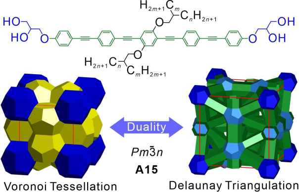 近期,西安交通大學(xué)材料學(xué)院劉峰教授團隊與德國哈勒維滕貝爾格馬丁路德大學(xué)Carsten Tschierske教授合作,在以棒狀基元為核心的不對稱星形多親性分子中,首次發(fā)現(xiàn)基于四面體網(wǎng)絡(luò)結(jié)構(gòu)的A15立方相。分子結(jié)構(gòu)如圖所示,核心為棒狀低聚亞苯基亞乙炔基(OPE),兩端為極性的丙三醇形取代基,側(cè)鏈為非對稱支化脂肪鏈。通過運用差示掃描法、偏光顯微鏡以及同步輻射小角X射線散射等測試方法,對該結(jié)構(gòu)進行了詳細的表征和分析。該結(jié)構(gòu)對應(yīng)于A15晶胞的德洛奈三角剖分(Delaunay Triangulation,DT),為常見Weaire-Phelan結(jié)構(gòu)的拓撲學(xué)對偶,因此通過適當?shù)耐卣箍梢灾苽淦渌Y(jié)構(gòu)的FK相甚至液態(tài)準晶結(jié)構(gòu)。