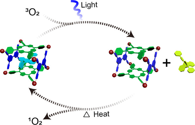 針對(duì)這一問(wèn)題,西安交通大學(xué)材料學(xué)院的張明明課題組利用四羧酸聯(lián)苯與四吡啶卟啉作為構(gòu)筑基元,通過(guò)Pt基配體的連接構(gòu)筑了桶狀的卟啉基金屬有機(jī)籠。這種多齒配體的螯合配位利用金屬配位鍵的協(xié)同性大大提高了其結(jié)構(gòu)的穩(wěn)定性,為其功能的研究與拓展奠定了基礎(chǔ)。值得指出的是,在該結(jié)構(gòu)中兩個(gè)卟啉分子之間的距離為8.0 Å,有利于通過(guò)π -π堆積作用來(lái)有效地識(shí)別多環(huán)芳烴類(lèi)分子。當(dāng)蒽的衍生物作為客體分子時(shí),該金屬有機(jī)籠在光照下可以有效地產(chǎn)生單線態(tài)氧用以氧化其內(nèi)部包裹的客體分子,進(jìn)而破壞蒽衍生物的平面結(jié)構(gòu),使得其主客體結(jié)合能力大大下降,從而在金屬籠的空腔里被釋放出來(lái)。進(jìn)一步加熱該體系會(huì)使得氧化的客體分子釋放出單線態(tài)氧回到其初始狀態(tài),進(jìn)而被重新包裹到金屬籠的空腔內(nèi)。這種通過(guò)光氧化驅(qū)動(dòng)的客體的可逆封裝與釋放過(guò)程有望被用于構(gòu)建新型的刺激響應(yīng)性材料。