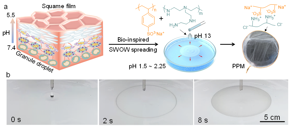 圖1受皮膚分化過(guò)程啟發(fā)的水-水鋪展與聚電解質(zhì)膜制備機(jī)制