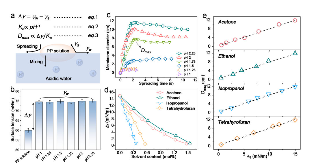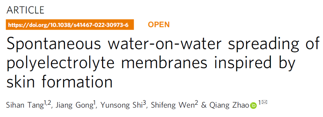 近期,趙強(qiáng)教授課題組在《Nature Communications》在線刊發(fā)了該領(lǐng)域的新進(jìn)展(Spontaneous water-on-water spreading of polyelectrolyte membranes inspired by skin formation, Nat. Commun. 13, 3227, 2022.),提出了一種聚電解質(zhì)水溶液在水面自發(fā)鋪展,形成多孔膜的機(jī)制。文章第一作者是化學(xué)與化工學(xué)院2020屆碩士畢業(yè)生湯思晗,合作單位包括華中科技大學(xué)材料科學(xué)與工程學(xué)院,協(xié)和醫(yī)院。研究得到國(guó)家自然科學(xué)基金,國(guó)家重點(diǎn)研發(fā)計(jì)劃和三峽實(shí)驗(yàn)室開(kāi)放基金的支持。