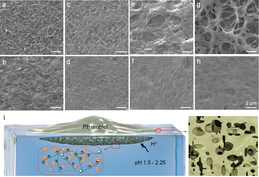 該工作研究了表面張力和pH對(duì)聚電解質(zhì)的組裝行為和多孔膜微結(jié)構(gòu)、宏觀尺寸的影響(圖3)。本方法無(wú)需表面活性劑或降低液滴尺寸,簡(jiǎn)化了水-水自發(fā)鋪展和多孔膜的制備過(guò)程,適用于多種聚電解質(zhì)和納米材料,擴(kuò)大了相溶界面材料組裝的應(yīng)用范圍。通過(guò)該方法制備的多孔聚電解質(zhì)-碳材料復(fù)合膜在1個(gè)太陽(yáng)的照射下表現(xiàn)出優(yōu)異的水蒸發(fā)脫鹽性能(2.8 kg/m2h)。該工作提出了聚電解質(zhì)水溶液在水表面自發(fā)鋪展和組裝成膜的新機(jī)制,為聚合物在界面自組裝的微觀結(jié)構(gòu)調(diào)控以及在膜分離、脫鹽等領(lǐng)域應(yīng)用提供了新思路。