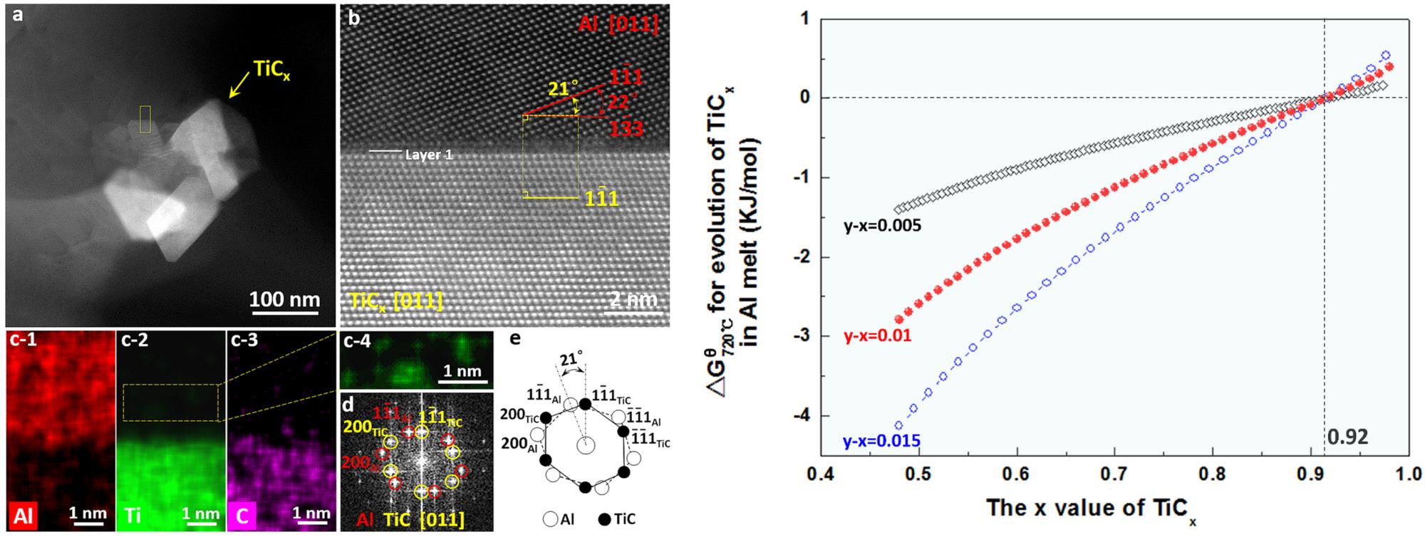 首先,在基礎(chǔ)研究方面,相關(guān)成果以“A new insight into heterogeneous nucleation mechanism of Al by non-stoichiometric TiCx”為題發(fā)表在金屬材料領(lǐng)域頂級(jí)期刊《Acta Materialia》。研究發(fā)現(xiàn),異質(zhì)形核襯底TiCx與α-Al間獨(dú)特的晶體學(xué)位向關(guān)系:[011]Al//[011]TiCx,(111)[011]Al與(111)[011]TiCx呈 21°夾角,該夾角的形成從理論上為了消除Al與TiCx晶格參數(shù)的差異,提高了晶格匹配度。通過熱力學(xué)計(jì)算結(jié)合第一性原理手段,首次提出TiCx與Al界面處富Ti過渡層的形成條件及關(guān)鍵閾值x,TiCx作為一種非化學(xué)計(jì)量比的化合物,在720℃的鋁熔體中,當(dāng)x<0.92時(shí),TiCx能夠不間斷地向鋁熔體中釋放Ti原子,從而使α-Al與TiCx之間形成富Ti過渡層,x越小,釋放Ti的熱力學(xué)驅(qū)動(dòng)力越大,TiCx的形核潛力越大。該研究得到了國(guó)家自然科學(xué)基金重點(diǎn)項(xiàng)目和國(guó)家自然科學(xué)基金的資助。