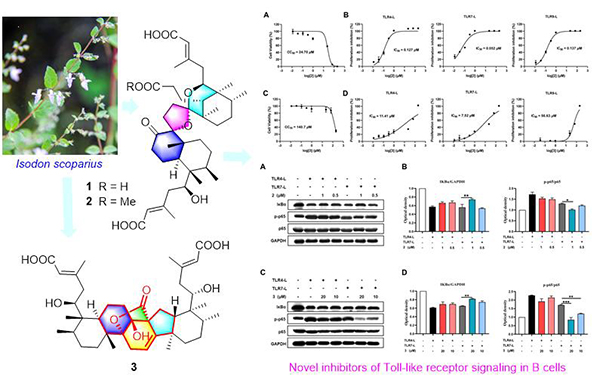 近期,專題組從該種植物中又發(fā)現(xiàn)了兩類(3個)具有新穎6/6/5/6/6雙螺環(huán)骨架和6/6/5/6/5/6多環(huán)骨架的對映-克羅烷型二萜二聚體scoparicacids A–C(1–3,圖1),并通過分子內(nèi)雙羥醛縮合反應(yīng)從前期已發(fā)現(xiàn)的scospirosin A出發(fā)一步構(gòu)建骨架中的5/6/5環(huán)系,實現(xiàn)了3的半合成(圖2),從而確定了其絕對構(gòu)型。通過藥理學(xué)研究表明:化合物1對脂多糖(Toll樣受體4(TLR4)激動劑)和刀豆蛋白A誘導(dǎo)的B和T淋巴細(xì)胞的增殖均表現(xiàn)出顯著的免疫抑制活性(IC50: 2.24 ± 0.32和7.21 ± 0.13 μM);化合物2和3選擇性地抑制B淋巴細(xì)胞增殖(IC50: 0.142 ± 0.02 和 12.07 ± 1.05 μM);并且化合物2和3也對TLR7和TLR9激動劑誘導(dǎo)的B淋巴細(xì)胞增殖產(chǎn)生顯著的抑制作用,其中化合物2的活性更強(qiáng)(IC50: 0.055± 0.01和 0.145± 0.01 μM;CC50: 24.61 μM)。圍繞TLR4及TLR7信號開展的作用機(jī)制研究表明,化合物2和3對TLR7信號引起的增殖效應(yīng)更為敏感,并通過抑制其下游的NF-κB信號轉(zhuǎn)導(dǎo)發(fā)揮抑制作用。該研究結(jié)果提示,化合物2和3對自身免疫性疾病中關(guān)鍵的TLR信號及其誘導(dǎo)的免疫細(xì)胞效應(yīng)具有選擇性的抑制活性,作為自身免疫相關(guān)疾病的潛在候選分子具有理想的開發(fā)前景。