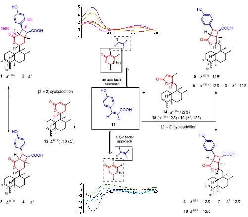 除二萜二聚體外,專題組還從該種植物中發(fā)現(xiàn)了10個新的雜二萜scopariusicides D–M(1–10)。該類化合物均含有環(huán)丁烷并γ/δ-內(nèi)酯結(jié)構(gòu)片段,其絕對構(gòu)型通過譜圖分析、單晶X-射線衍射分析、化學(xué)轉(zhuǎn)化和TDDFT ECD計算等多種方法確證。對于該類化合物的生源合成途徑分析表明,其推測是由苯丙素與對映-克羅烷二萜通過[2+2]頭尾相連(head-to-tail)的加成方式所產(chǎn)生,且其ECD譜圖與加成的正/反面接近方式具有相關(guān)性(圖3)。藥理學(xué)研究表明,化合物5對皮質(zhì)酮誘導(dǎo)的PC12細(xì)胞損傷表現(xiàn)出顯著的保護(hù)作用;6和7對CD3/CD28抗體激活T細(xì)胞表現(xiàn)出中等的免疫抑制活性。