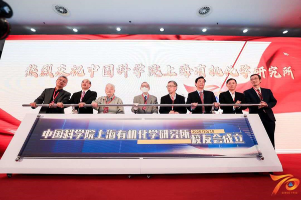 在建所70周年的喜慶日子,有機(jī)所校友會(huì)正式揭牌。中國(guó)科學(xué)院大學(xué)校友會(huì)辦公室劉紅雨主任宣布中國(guó)科學(xué)院大學(xué)校友會(huì)辦公室關(guān)于同意成立中國(guó)科學(xué)院上海有機(jī)化學(xué)研究所校友會(huì)的批復(fù)。國(guó)科大校友會(huì)秘書長(zhǎng)馬石莊教授,李正華書記,我所陸熙炎院士、戴立信院士、陳慶云院士、林國(guó)強(qiáng)院士和唐勇所長(zhǎng)、胡金波書記,共同為校友會(huì)成立揭牌。馬石莊秘書長(zhǎng)致辭。校友會(huì)成立環(huán)節(jié)由上海有機(jī)所副所長(zhǎng)劉文主持。