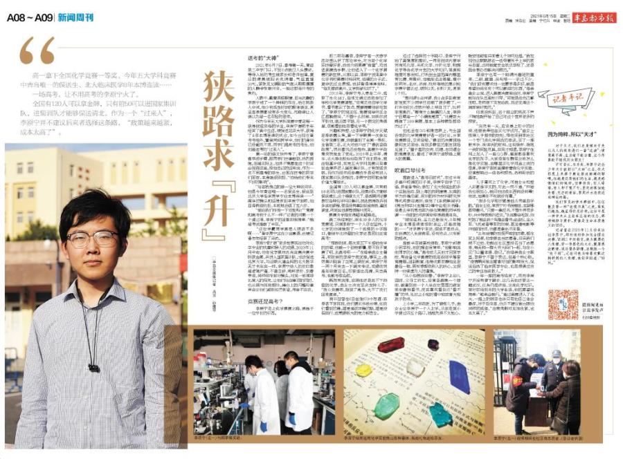 2018年,李原寧考入青島二中,選擇了生化MT,后來又通過選拔參加了學?;瘜W競賽課程?!敖?jīng)常見他自學化學書,看書都忘了飯點,需要提醒他該吃飯了?!崩钤瓕幍陌嘀魅巍⒏傎惏鄬熗鹾辖杏|很深,“不管什么時候,如果你找不到他,就去圖書館,在一個固定的角落里,總能看到他在看化學書?!?/p>