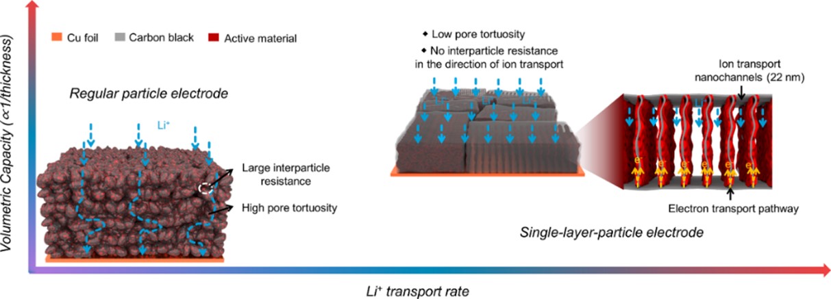鋰離子電池的快速充電能力直接影響其在3C電子產(chǎn)品和電動汽車等領(lǐng)域的應(yīng)用。電池的快充能力與電極結(jié)構(gòu)密切相關(guān)。常規(guī)的電極由隨機堆疊的活性顆粒組成,其內(nèi)部孔結(jié)構(gòu)隨機無序(圖1,左),需要降低電極載量和厚度來縮短鋰離子在電極中的傳輸距離,從而提升電極的快充性能。然而,這大大降低了活性物質(zhì)在電極整體中的占比(活性材料/(活性材料+非活性材料)),犧牲了電池的整體能量密度。因此,亟需實現(xiàn)在保持電極高面容量的情況下,提高電池的快充性能,從而滿足3C電子產(chǎn)品和電動交通工具對能量密度和快充性能的綜合需求。