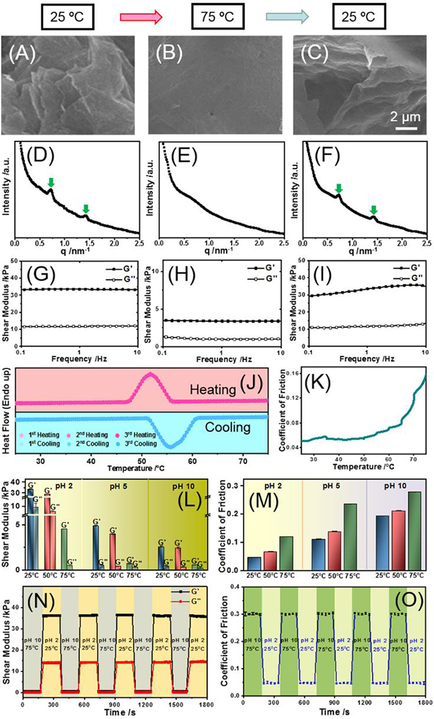 圖3. 水凝膠的熱響應(yīng)性及pH和溫度對(duì)水凝膠機(jī)械和摩擦學(xué)性能的雙驅(qū)動(dòng)行為