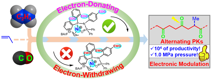 聚烯烴主鏈引入羰基可以賦予其親水性、氣體阻隔性、表面性能以及特定的功能性,尤其是羰基會促進高分子鏈間強偶極相互作用,從而提高其結晶性和耐熱性。羰基長期暴露旨在紫外光下能夠發(fā)生光降解,因此,羰基高分子也是一種環(huán)保型特種材料。目前,工業(yè)上制備羰基高分子大多使用價格昂貴的金屬鈀配合物,而對于更為廉價的金屬鎳催化體系,研究非常有限,主要原因在于高度親電的鎳金屬中心特別容易被單體毒化,導致鎳催化劑的反應活性和所得聚酮的轉化數(shù)均遠遠低于鈀催化體系,且對溫度和使用壓力要求較高,因此,開發(fā)簡單、高效且穩(wěn)定的鎳催化體系極具工業(yè)應用前景,但同樣存在巨大的挑戰(zhàn)性。