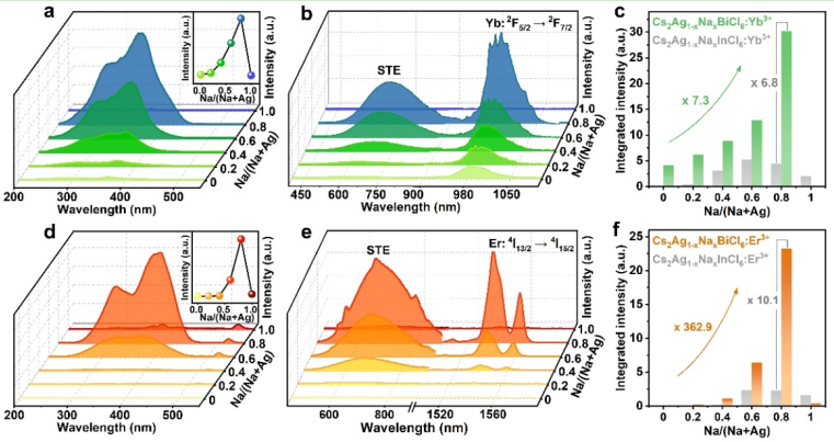Cs2AgBiCl6雙鈣鈦礦是一種新興的環(huán)境友好型無(wú)鉛鈣鈦礦材料,研究團(tuán)隊(duì)通過(guò)稀土離子摻雜引入近紅外發(fā)光中心,基于Na/Ag合金化手段合成了一系列不同組份Cs2Ag1-xNaxBiCl6:Yb3+和Cs2Ag1-xNaxBiCl6:Er3+材料。與不含Na+離子的Cs2AgBiCl6相比,在Cs2Ag0.2Na0.8BiCl6材料中,Yb3+和Er3+的近紅外發(fā)光強(qiáng)度可分別提高7.3倍和362.9倍(圖1),最佳近紅外發(fā)光量子產(chǎn)率分別為19.0%和4.3%。